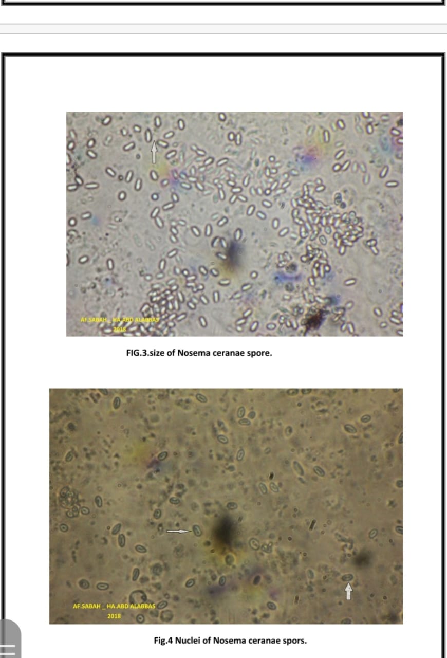 350 samples of honeybees were collected from five Provinces of Iraq ( Baghdad , Diala , Alnajaf , Karbala and Babil ) , The results showed depending on the characteristics of the pathogen that the disease found in three Provinces ( Baghdad , Diala and Babil ) with incidence ranged between( 50-100)% .Genetic marker for the pathogen ,simple sequence repeat( SSR) was used to differentiation between Nosema ceranae and Nosema apis, primer pair product a band with( 218bp).Honey bees consider one of the most important beneficial insects and its importance comes through the production of honey , which is considered an important health food, in addition to that it is a good income for many beekeepers in the world . In addition to its honey production , it produces royal gel as well as bee wax which is a good resource of income too , and play an important role in pollinating plants(shamout,A.etal,2014).In the last years the beekeeper are expanded in Iraq due to the many facilitations which are given by plant protection directorate / ministry 0f agriculture to them.This expansion was accompanied by many emerge diseases that must be considered . One of these diseases is Nosema ceranae which is consider one of the most important modern disease .The disease is wide world and exists on all seasons because it can live in wide range of temperature.(Higes etal.,2010) . From total of (7 ) honey bees apaires , ( 350 ) samples of bees were tested in order to discover the disease ( Nosema Ceranae ) , the results showed that ( 4 ) honey bees aparies were infected , also the ratio of infection was between ( 50% to 100% ) , where as noted existing of spores of the disease by microscope , on other side no infection was found in other honeybees apaires , also has been noted that the spores of disease have elliptical shapes and have different sizes ranging between ( 2 – 2.5 ) micrometer width and ( 5.3 – 3.9 ) micrometer length.see Fig. 1,2
